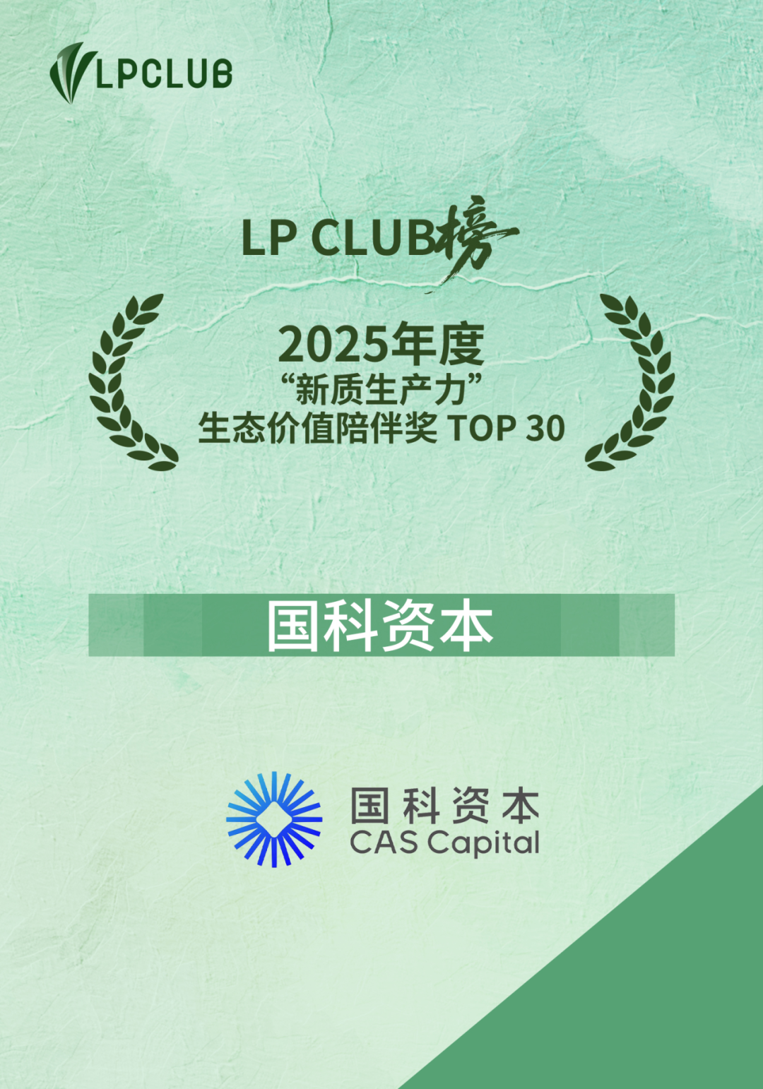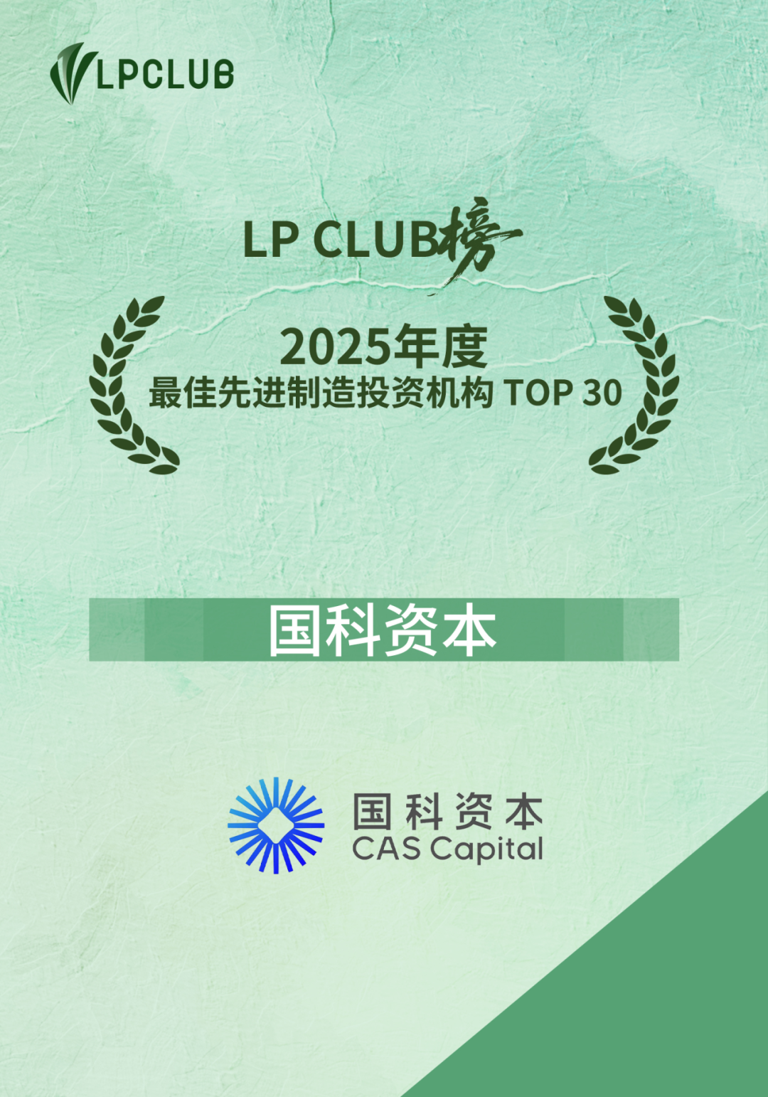 2026 年 1 月 15 日,LP CLUB 榜・2025 年度榜单评选结果正式重磅发布,国科资本荣登“产业资本战略投资优秀LP机构 TOP 20”“新质生产力生态价值陪伴奖 TOP 30”“最佳先进制造投资机构 TOP 30”“最佳股权/PE投资机构 TOP 40”四项榜单。