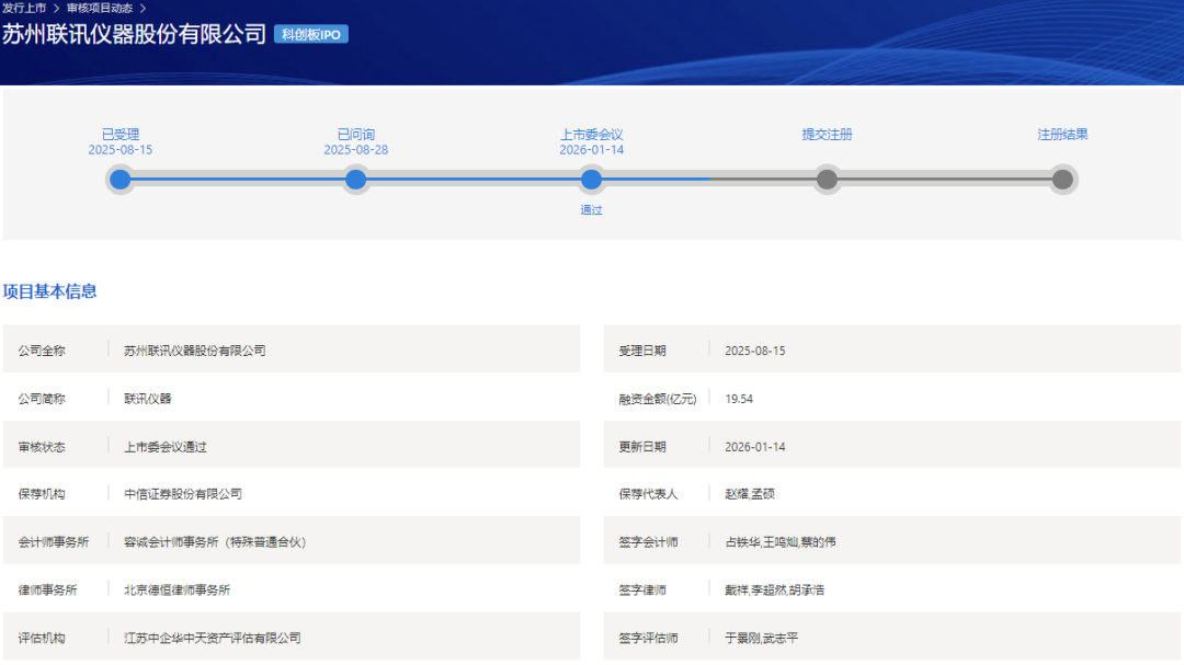 CASC News 1月14日,国科资本子公司国科长三角资本管理有限公司投资企业苏州联讯仪器股份有限公司(简称:联讯仪器)的IPO申请在上交所科创板成功过会。 **上交所公示信息 联讯仪器是国内领先的高端测试仪器设备企业,主营业务为电子测量仪器和半导体测试设备的研发、制造、销售及服务,专业为全球高速通信和半导体等领域用户提供高速率、高精度、高效率的核心测试仪器设备,助力人工智能、新能源、半导体等前沿科技行业提升产品开发和量产效率,是国家重大战略需求领域实现核心基础仪器设备国产化攻坚与自主可控的重要力量。电子测量仪器方面,公司是全球少数、国内极少数量产供货400G、800G、1.6T高速光模块核心测试仪器的厂商,全球第二家推出目前业内最高水平1.6T光模块全部核心测试仪器的厂商,国内极少数可以提供PXIe插卡式源表、低漏电开关矩阵、高压源表、脉冲源等多产品矩阵的厂商。半导体测试设备方面,公司是国内极少数覆盖芯片、晶圆等光通信产业链上游核心环节测试需求的厂商,极少数同时实现晶圆级老化系统、功率芯片KGD分选测试系统产业化应用的厂商,少数具备精密源表等核心测试部件自主能力的厂商。