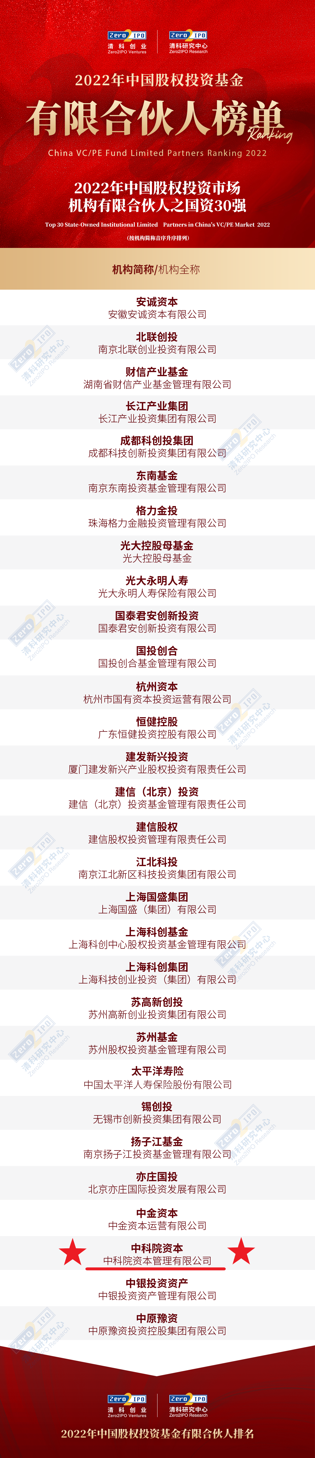 中科院资本荣膺清科"2022年中国股权投资市场机构有限合伙人之国资30强"