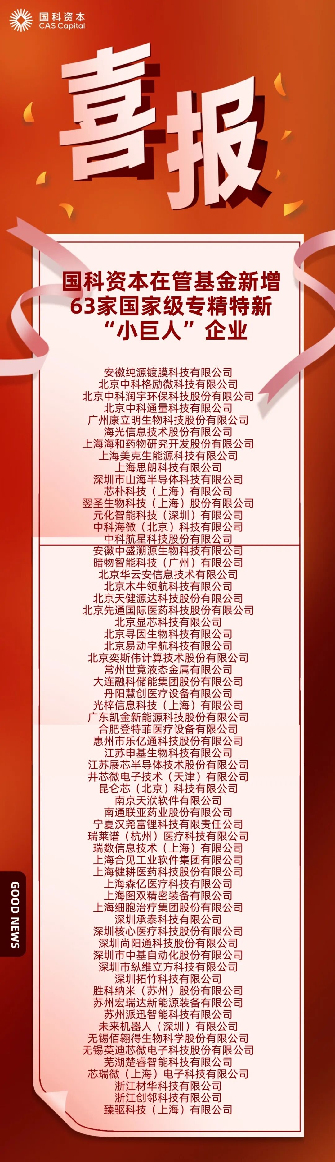 CASC Family | 国科资本在管基金新增63家国家级专精特新“小巨人”企业