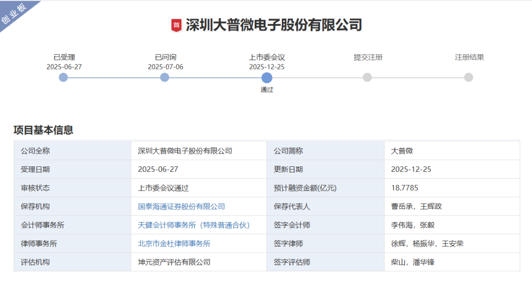 2025年12月25日,国科资本投资企业深圳大普微电子股份有限公司(简称:大普微电子)的IPO申请在深交所创业板成功过会。